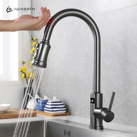 温度表示キッチン蛇口304ステンレススチールプルダウンとスマートタッチ3ウェイ冷水タップ付き